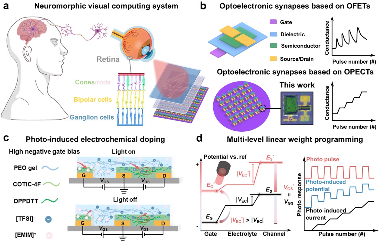 光电突触器件在推动类脑人工智能和类视觉系统发展中发挥着关键作用。近年来,基于有机场效应晶体管的光电突触器件备受关注,但也面临多方面的挑战,例如其编程非线性度大、存储状态有限、响应波长范围受限(通常局限于紫外或可见光波段)。此外,由于有机半导体薄膜与传统光刻制备技术的不兼容,导致有机光电突触晶体管的晶圆级阵列化制备也是领域难题。