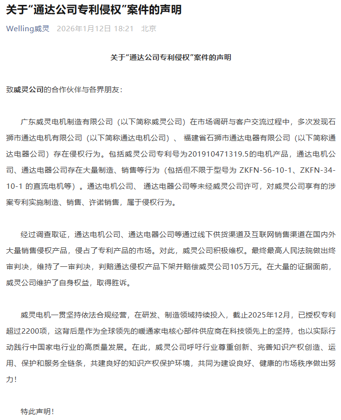 1月12日,广东威灵电机制造有限公司(以下简称“威灵电机”)正式发布声明,宣布其与石狮市通达电机有限公司、福建省石狮市通达电器有限公司(以下合称“通达公司”)的专利侵权纠纷案获得最高人民法院终审胜诉。