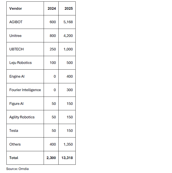 表1:2024年与2025年各厂商机器人出货量(Omdia预估)
