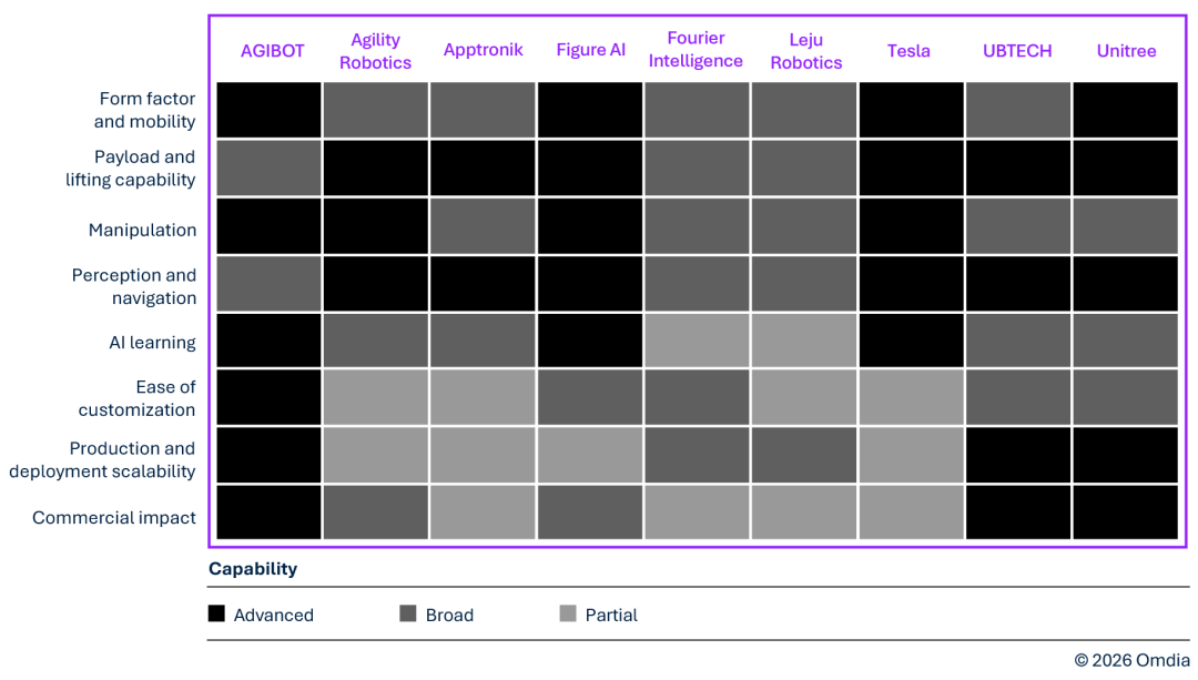 受具身智能、AI学习以及人机交互突破的驱动,多家主要厂商正在引领市场,包括AGIBOT、Agility Robotics、Apptronik、Figure AI、Fourier Intelligence、Leju Robotics、UBTECH和Unitree。