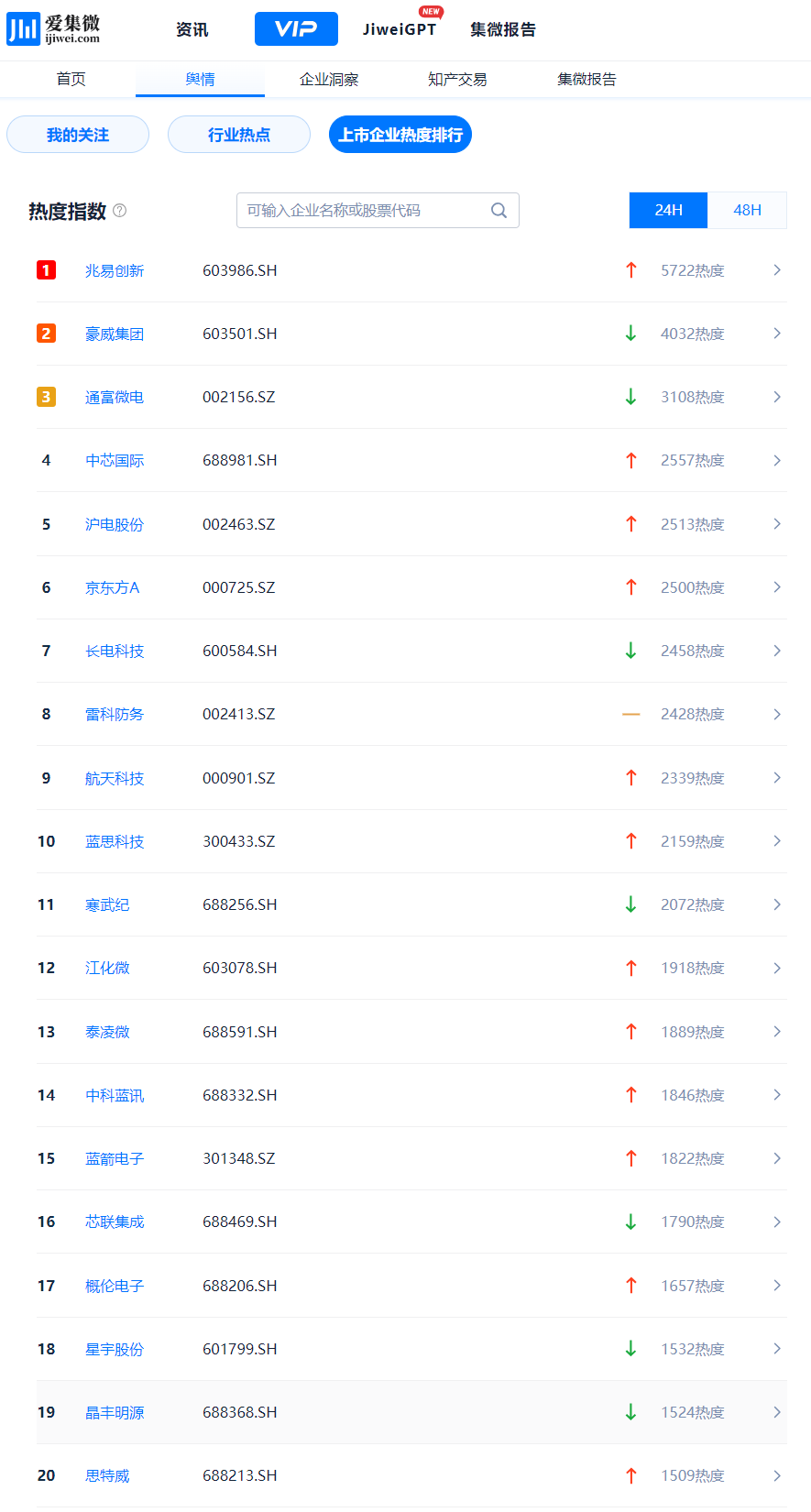 登录爱集微VIP频道,实时查看动态“上市企业热度排行”,穿透洞察每一个波动背后的驱动因素。