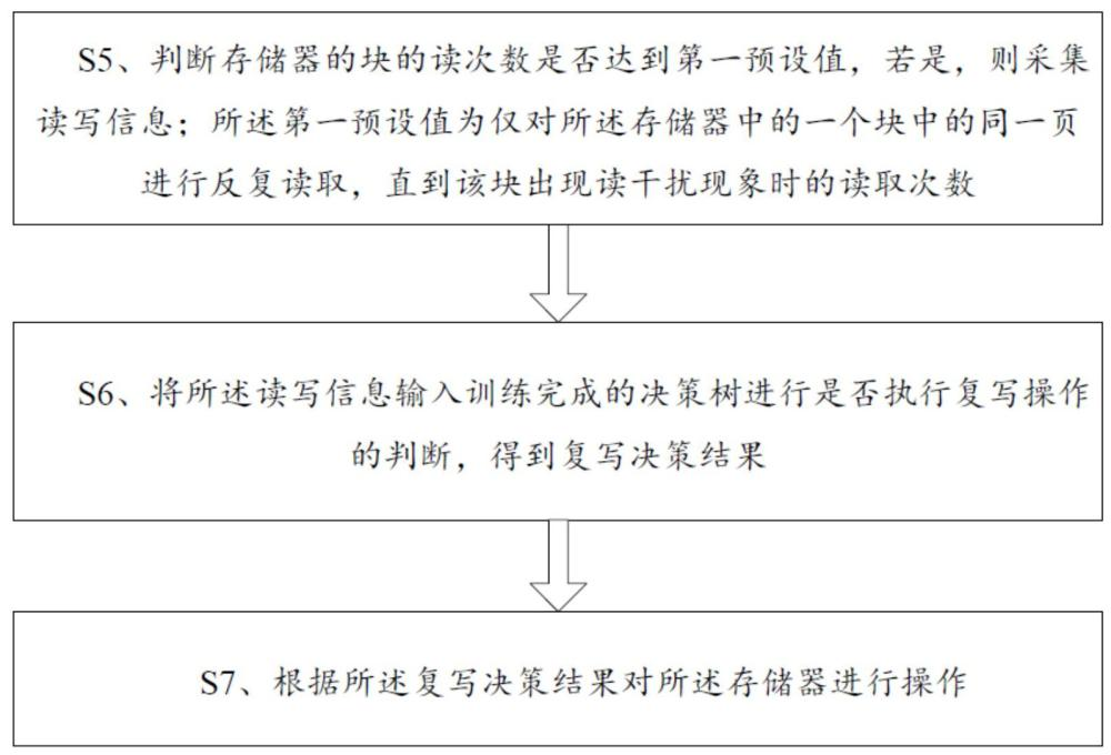 本发明公开了一种复写决策方法、装置、可读存储介质及电子设备,当存储器的块的读次数达到第一预设值时,采集读写信息,将读写信息输入训练完成的决策树进行是否执行复写操作的判断,得到复写决策结果,根据复写决策结果对存储器进行操作,第一预设值为仅对存储器中的一个块中的同一页进行反复读取,直到该块出现读干扰现象时的读取次数,不再像现有技术中,只根据块的读次数是否达到阈值进行是否执行复写的简单判断,而是在块的读次数达到第一预设值时,将采集到的读写信息输入训练完成的决策树中综合判断是否执行复写操作,从而减少无效复写,并降低搬移写入次数,进而提高了存储器运行效率和使用寿命。