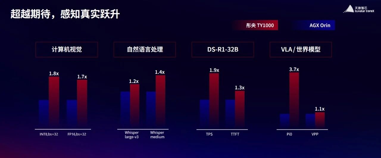 值得关注的是,彤央全系列产品的标称算力均为实测稠密算力,覆盖100T到300T范围。在计算机视觉、自然语言处理、DeepSeek 32B 大语言模型、具身智能VLA模型及世界模型等多个场景的实测中,彤央TY1000的性能全面优于英伟达AGX Orin。天数智芯副总裁郭为表示,彤央系列产品的目标是做到边端大算力国内第一,为物理 AI 连接物理世界提供最优载体,推动生成AI向“会做事”的物理 AI 转型
