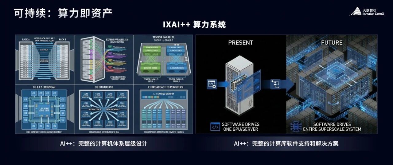天数智芯打造的AI++算力系统新范式,统一芯片内与芯片外构建算力系统,建立软件驱动算力系统的全新模式,以底层库为基石,以模型与计算中间层为支柱,用软件的智慧,释放硬件的潜能,支撑上层不断繁荣的应用生态。
