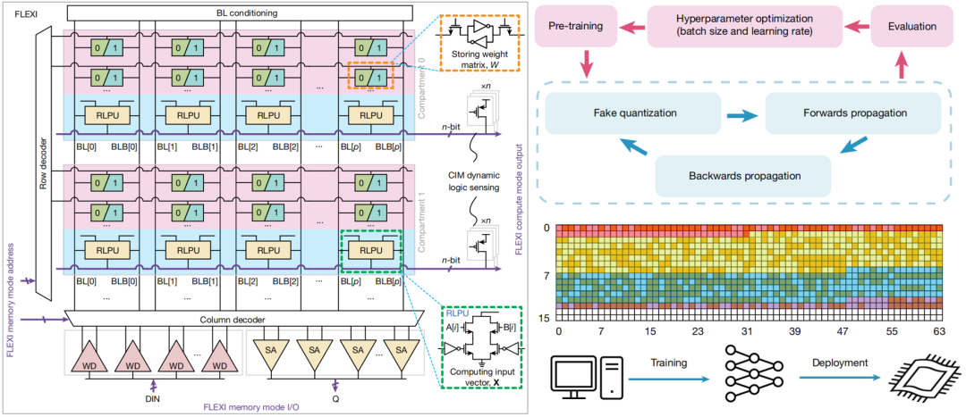 图2.FLEXI存内计算架构电路;结合量化感知训练与贝叶斯优化的双环训练策略;芯片上权重分布可视