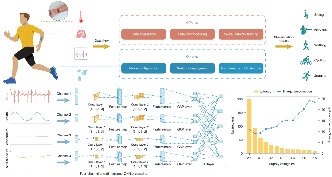 在应用验证方面,研究团队将 FLEXI 用于日常活动的连续监测与识别,展示了其在可穿戴健康监测和多模态传感器内计算中的应用前景。团队采集了受试者在不同状态下的心率、呼吸频率、体温和皮肤水分等多模态生理信号,构建了轻量级四通道卷积神经网络,并在 FLEXI-1 上实现一次性片上部署。通过量化感知训练,该模型在测试集上实现了 97.4% 的分类准确率。
