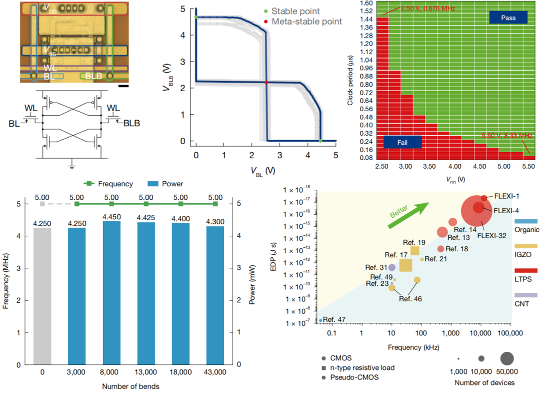 图3.6T-SRAM柔性单元显微图、电路结构及传输特性;FLEXI-4在存算模式下的Shmoo测试;FLEXI-4经受43000次折叠测试过程中的性能监测;FLEXI系列芯片与其他柔性计算芯片的综合性能对比。