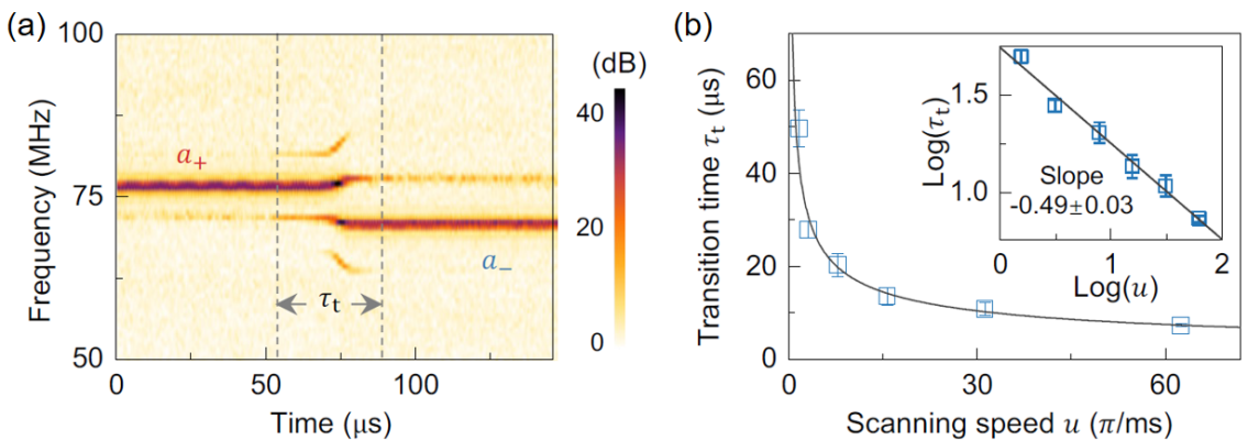 为此,研究团队以品质因子超过6×107的回音壁微腔产生的拉曼激光为研究体系,构建了“非厄米干涉耦合+射频拍频探测”的实验方案:通过自注入反馈回路连续调控注入相位,从而改变回注光与腔内光场的干涉状态,实现对系统增益与损耗平衡的连续调节。借助这一“可编程控制旋钮”,研究者可以以设定的速率跨越临界点,反复触发并对比不同扫描条件下的切换过程。实验表明,转变时间随控制参数扫速呈幂律下降,指数约为0.5(图2);进一步的研究表明,在耦合微腔网络中该指数仍保持普适的鲁棒性。
