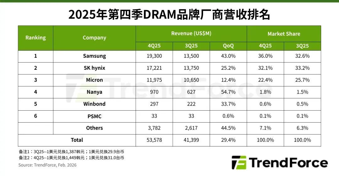 从各大供应商营收来看,2025年第四季度三星营收增至193.0亿美元,环比大增43.0%,市场份额回升3.4个百分点至36.0%,重返行业第一。SK海力士营收增至172.2亿美元,环比增长25.2%,市场份额下滑1.1个百分点至32.1%,排名降至第二。美光科技营收增至119.8亿美元,环比增长12.4%,市场份额下滑3.3个百分点至22.4%,排名第三。