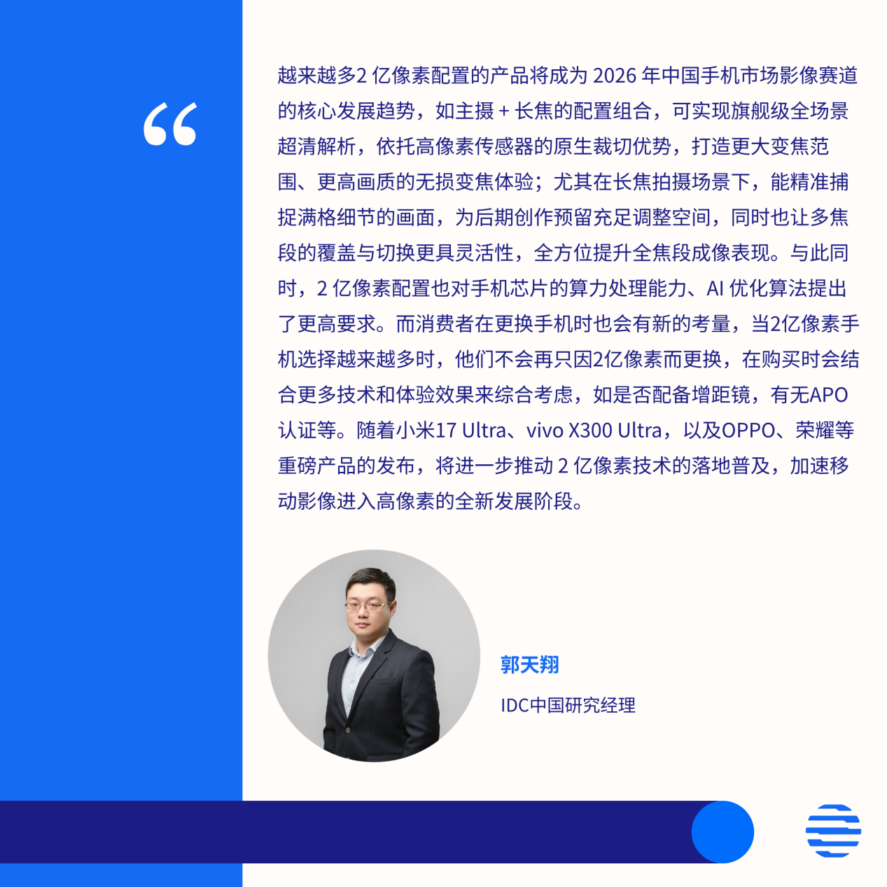 IDC认为,继大底传感器、可变光圈、全焦段覆盖等核心技术方向持续突破后,2亿像素摄像头将成为2026年中国手机市场影像赛道的全新发展趋势,2亿像素摄像头将进入全面普及阶段。