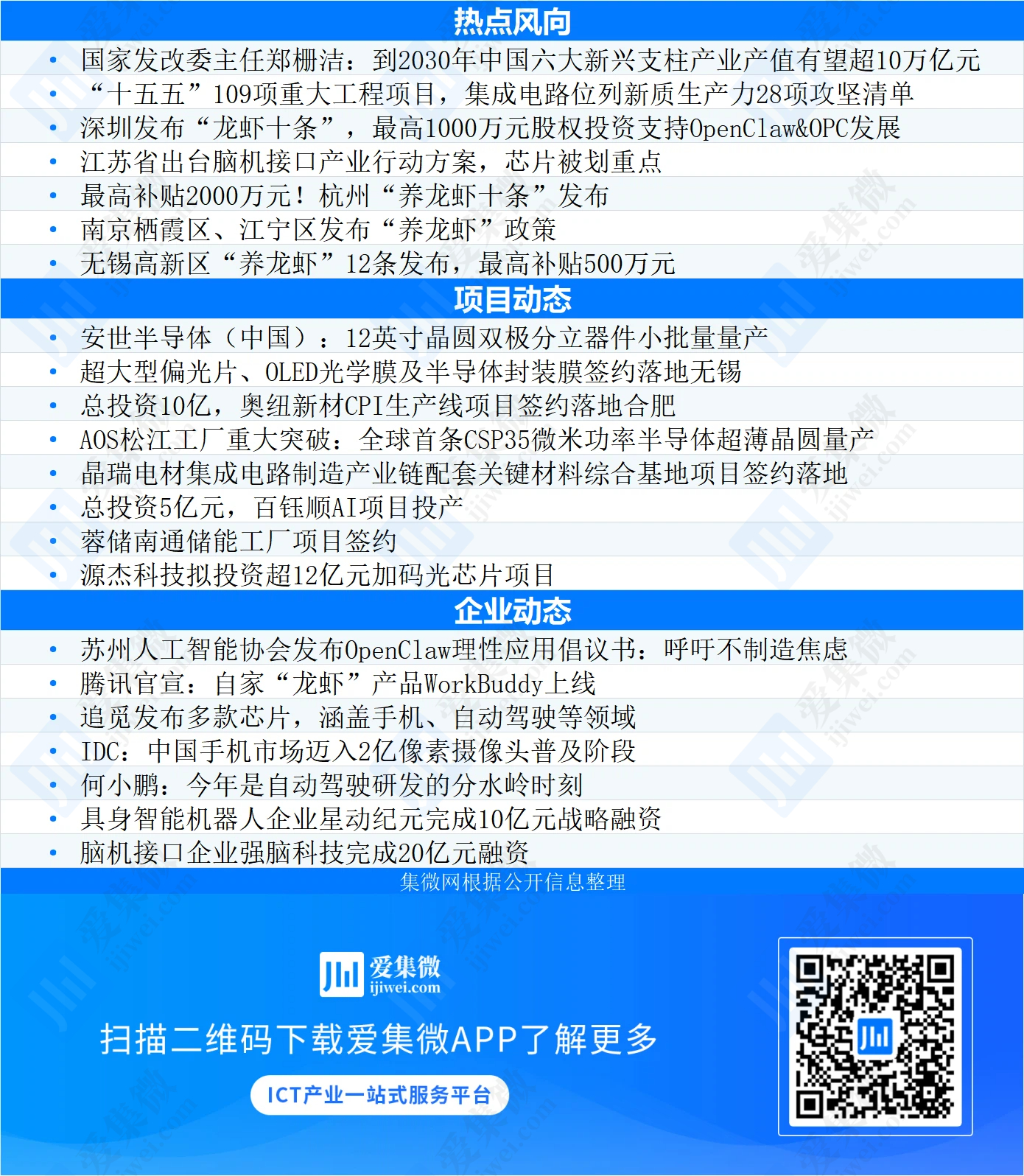 本周以来,到2030年中国六大新兴支柱产业产值有望超10万亿元;深圳发布“龙虾十条”;杭州“养龙虾十条”发布;安世半导体(中国)12英寸晶圆双极分立器件小批量量产;超大型偏光片、OLED光学膜及半导体封装膜签约落地无锡;苏州人工智能协会发布OpenClaw理性应用倡议书;追觅发布多款芯片……