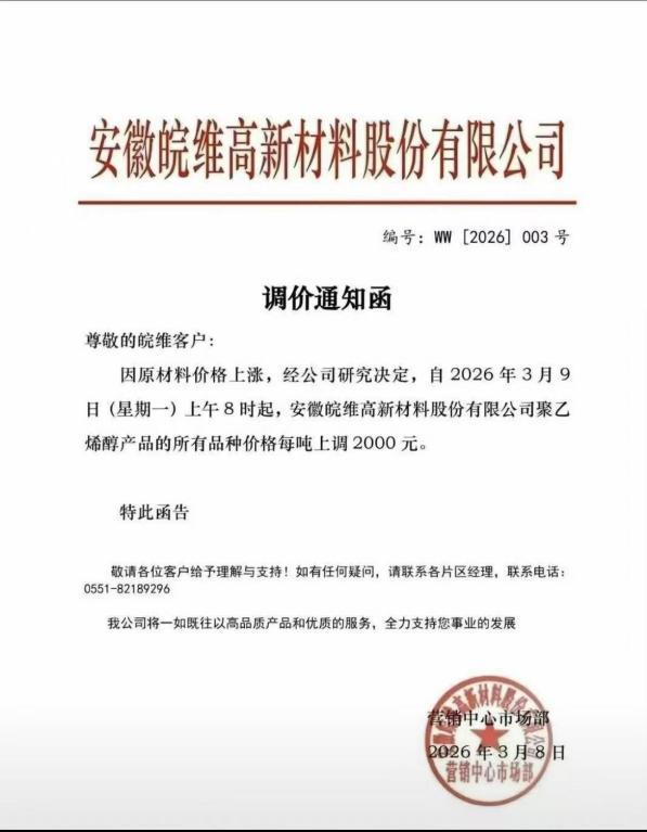 3月8日,皖维高新一则调价通知引发行业震动:受上游原材料价格持续上涨影响,公司决定自3月9日起,对旗下聚乙烯醇(PVA)全系列产品统一上调2000元/吨。仅隔一天,公司再度提价1000元/吨。短短两日内,累计涨幅达3000元/吨。