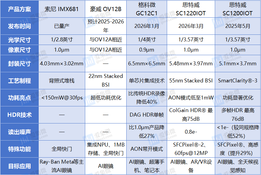 4大原厂5款AI眼镜主摄用1200万像素CIS规格比较