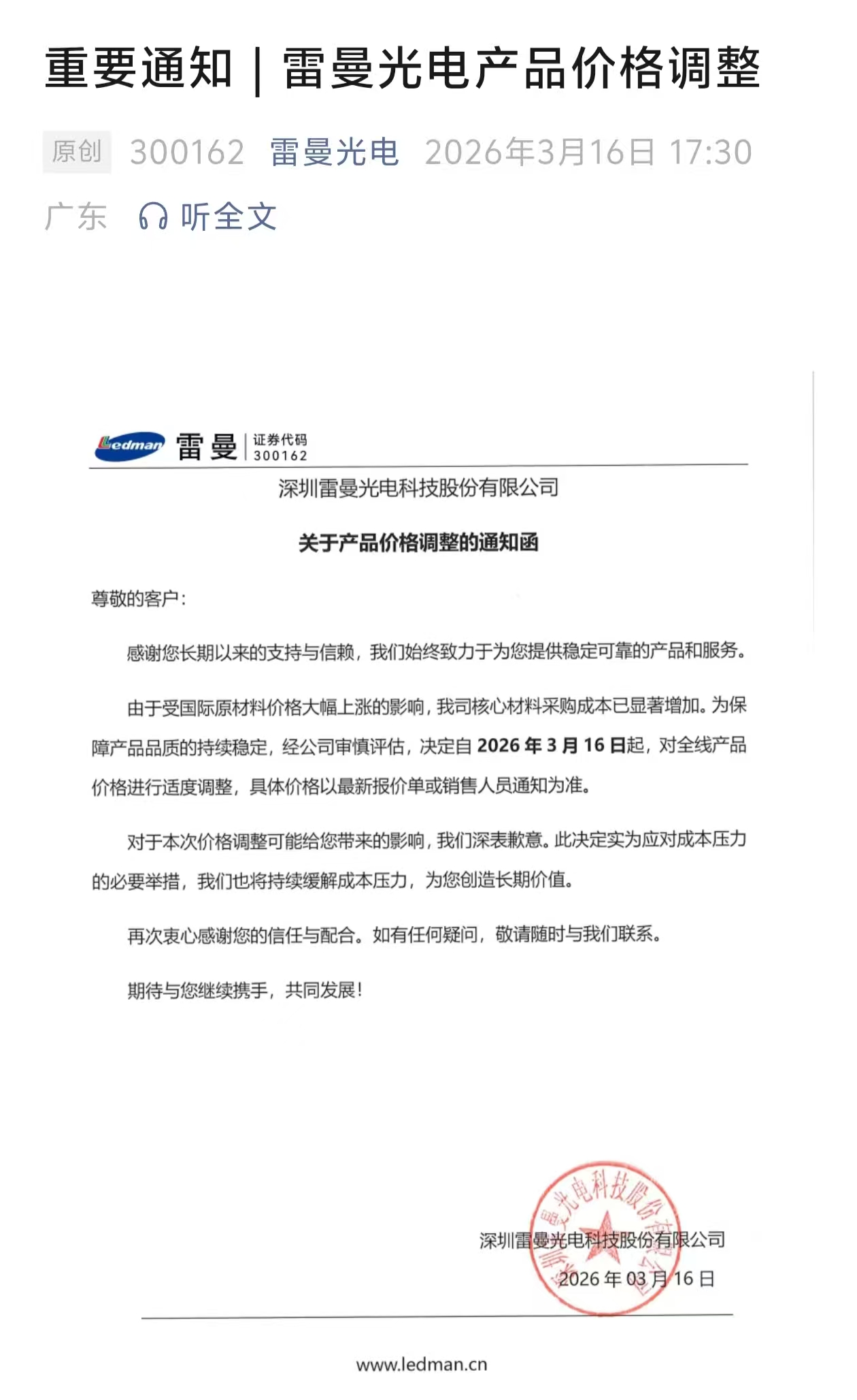3月16日,雷曼光电发布产品价格调整通知,受国际原材料价格大幅上涨、核心材料采购成本显著增加影响,公司决定自当日起对全线产品进行适度价格调整,以稳定产品品质与持续交付能力。