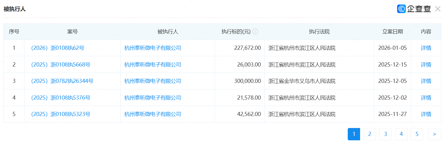 目前,杭州市滨江区人民法院已受理泰昕微电子破产审查申请,案件正处于进一步审理阶段。