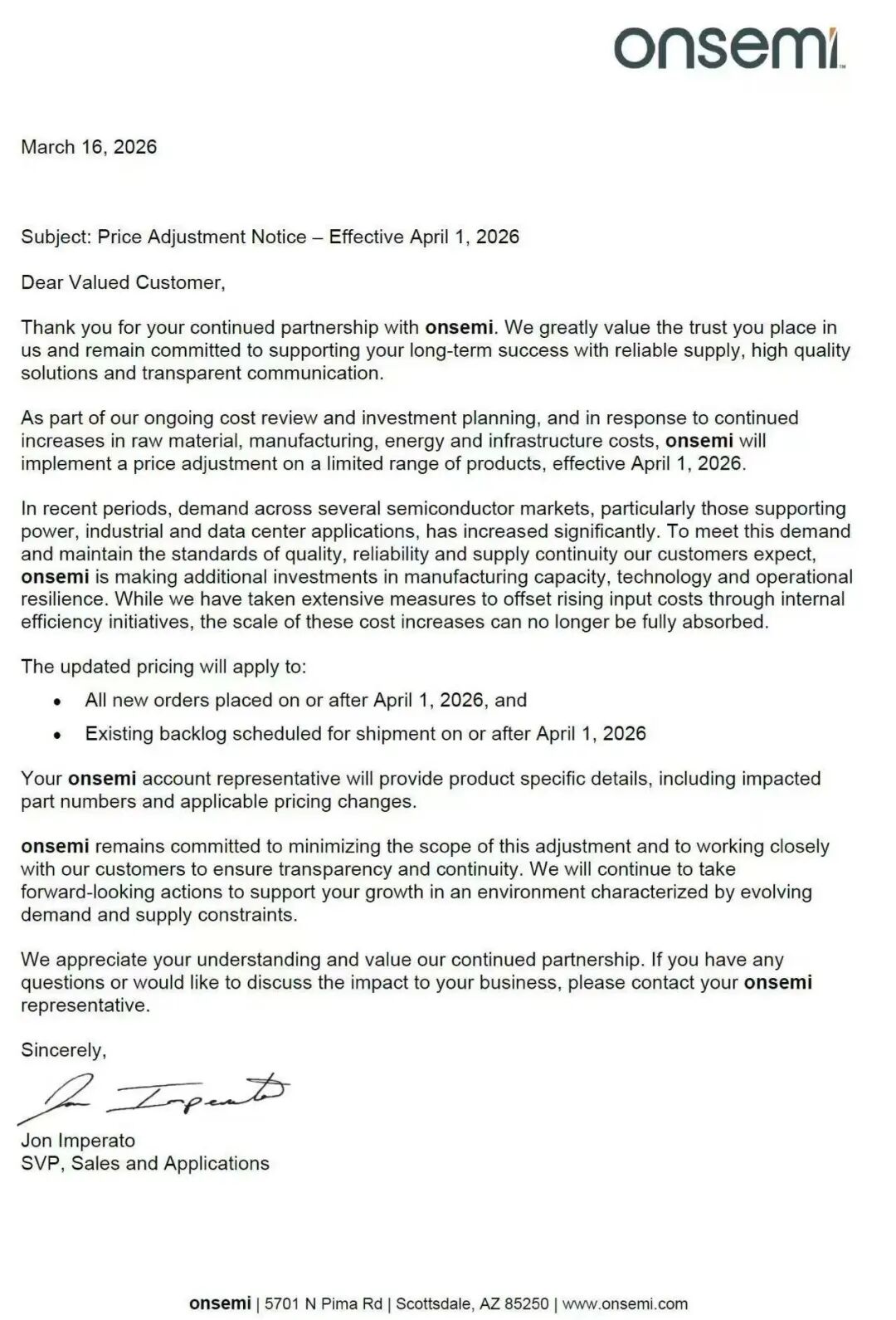 近期,多个半导体市场的需求显著增长,尤其是支持功率、工业以及数据中心应用的相关市场。为满足这一需求,并保持客户所期望的质量、可靠性和供应连续性标准,onsemi正在增加对制造产能、技术以及运营韧性的投资。尽管我们已通过内部效率提升措施,尽可能抵消不断上涨的投入成本,但当前成本上涨的规模已无法被完全吸收。