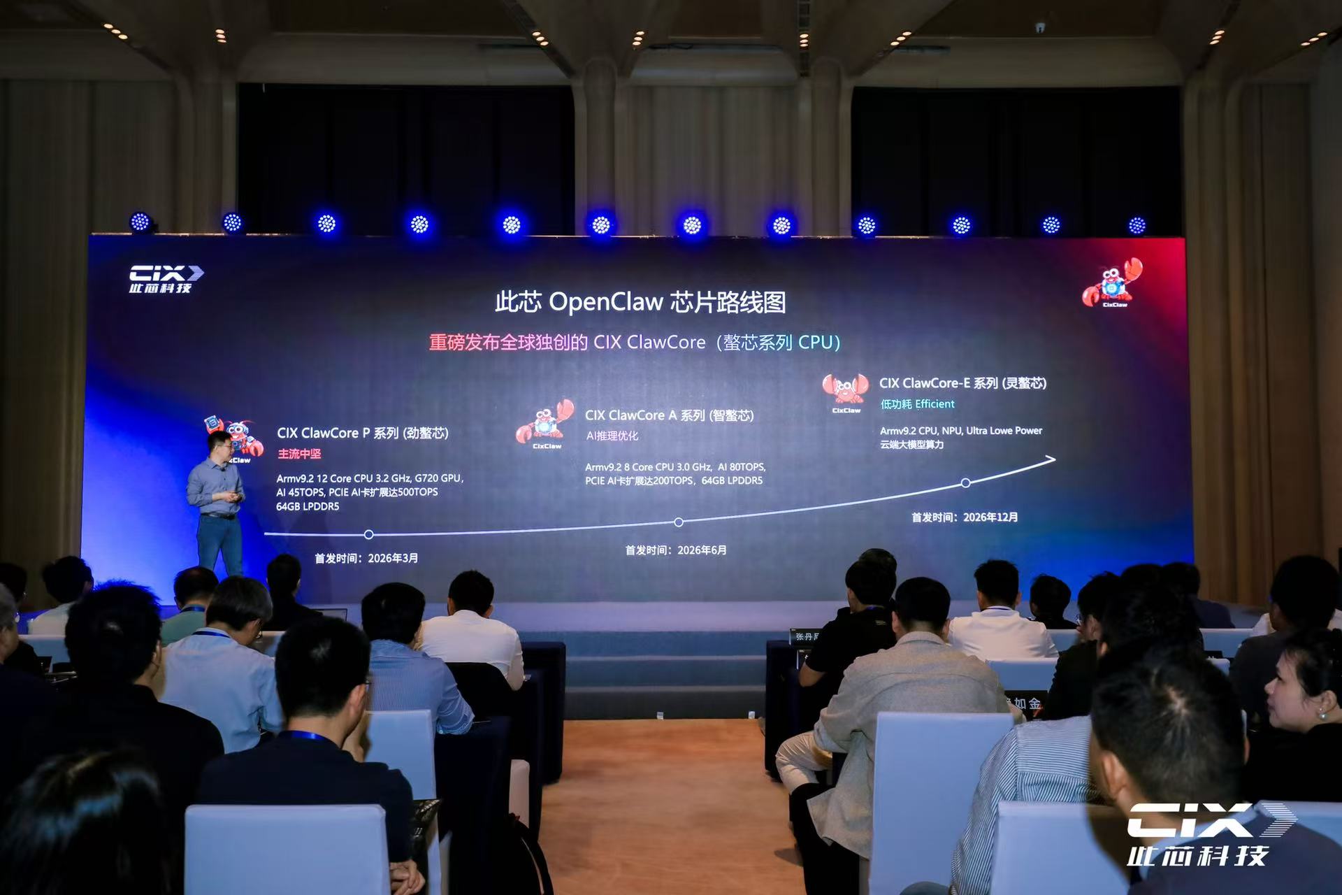 尤其是CIX ClawCore系列CPU,此芯科技一口气发布三大系列——ClawCore-E系列(端侧AI)、A系列(边缘AI)和P系列(高性能)。据介绍,E系列主打低功耗,可在端侧设备上进行小巧安装;A系列主打边缘侧和端侧AI场景,拥有强化NPU算力,能够对“多并发”进行很好的适配;P系列作为高性能系列产品,可以完成大部分端侧模型适配,让Agent、Skill畅通无阻地在端侧的设备、边缘侧设备上运行,适合高性能、高并发、大容量场景。