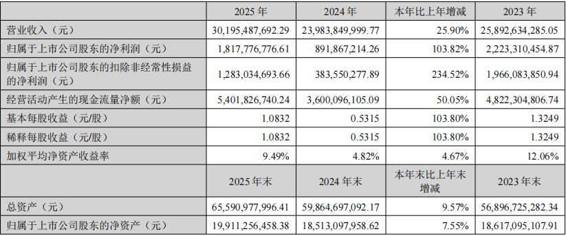 3月19日,中材科技发布2025年年度报告。报告显示,公司在2025年实现营业收入302亿元,同比增长25.9%;归属于上市公司股东的净利润为18.18亿元,同比增长103.82%;扣非后净利润为12.83亿元,同比增长234.52%。公司拟向全体股东每10股派发现金红利4.34元(含税),合计派发7.28亿元。