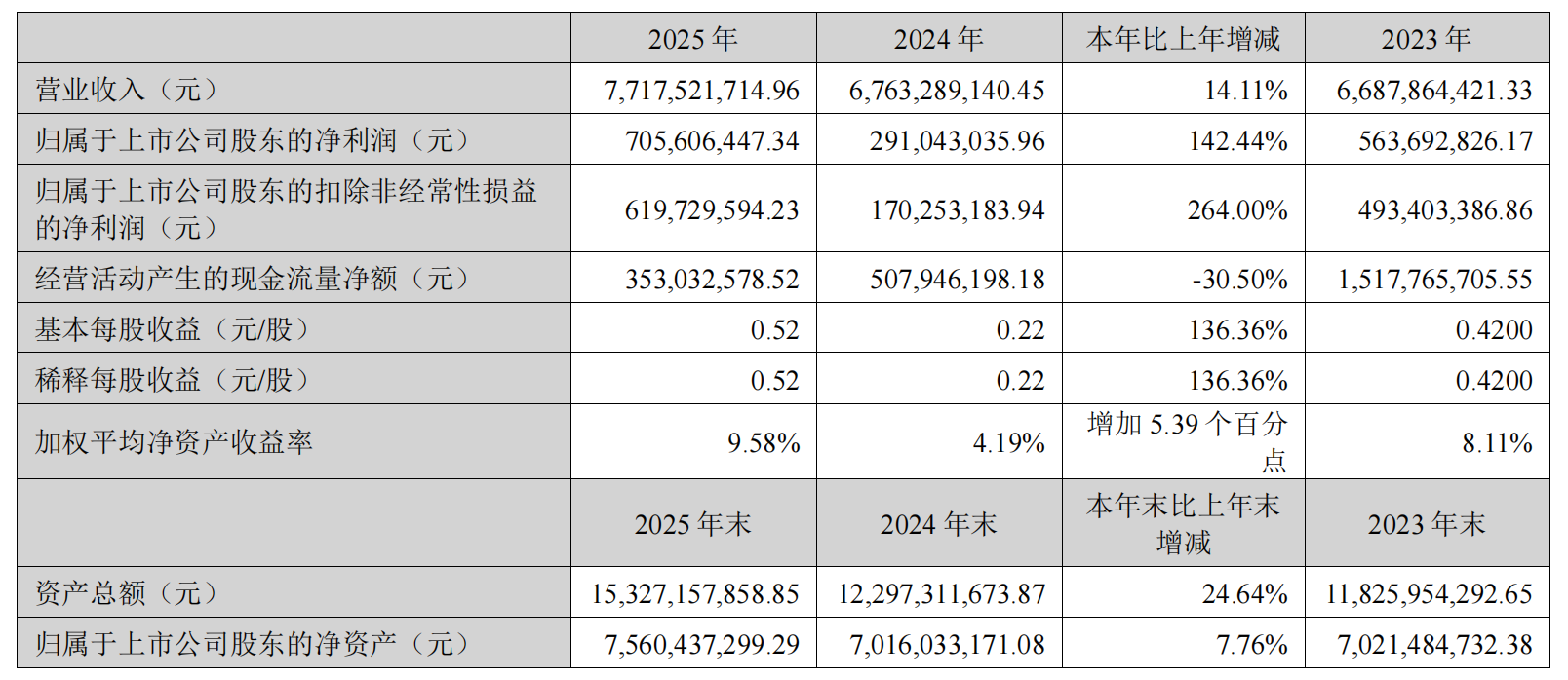 3月25日,金力永磁发布2025年年度报告,公司全年实现营业收入77.18亿元,同比增长14.11%;归属于上市公司股东的净利润7.06亿元,同比大增142.44%,扣非后净利润同比增幅达264%。