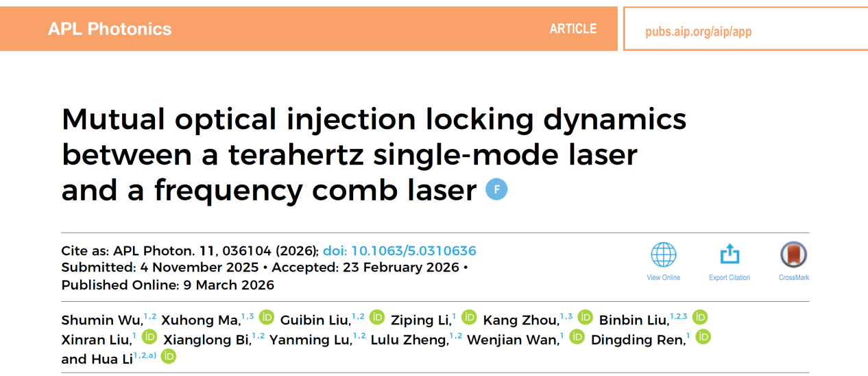 近日,中国科学院上海微系统与信息技术研究所黎华研究员团队在太赫兹(THz)量子级联激光器(QCL)光注入锁定领域取得重要进展。该研究提出了一种THz单模QCL与光频梳QCL之间的光学互注入(MOI)锁定方案,在无需外部锁定硬件(如锁相环、微波注入装置)的条件下,仅通过光学耦合即可实现频率同步。实验结果表明,当调节两个QCL之间的频率失谐时,可以清晰观察到MOI锁定现象,且在不同的主从激光配置上表现出明显的不对称性:当单模QCL作为主激光器时,光频梳受到扰动,如重复频率偏移、线宽展宽及锁定,最大锁定带宽约为30 MHz;而当光频梳QCL作为主激光器时,不稳定区域被抑制,锁定带宽显著扩展至94 MHz。在锁定范围内,重复频率的相位噪声和阿伦方差显著改善,表明光频梳的稳定性提高。这一紧凑的MOI锁定方案为芯片级THz光频梳的稳定、光频分应用奠定了基础。该成果于2026年3月10日以“Mutual optical injection locking dynamics between a terahertz single-mode laser and a frequency comb laser”为题在线发表在《APL Photonics》期刊,并被遴选为Featured Article。