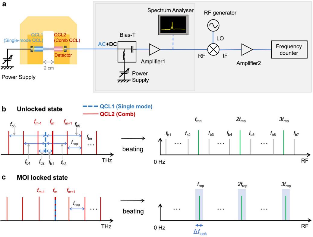 研究团队率先在实验上实现了THz波段单模QCL与光频梳QCL的光学互注入锁定。两个QCL 来自同一晶圆,通过面对面安装在 Y 型冷指上实现双向光学耦合(图1a)。实验中,单模 QCL 与光频梳 QCL 的状态通过调节电流偏置得到,可以控制两台激光器的频率差,实现从未锁定状态(图1b)至锁定(图1c)状态的改变。未锁定状态下,两个QCL之间弱耦合,单模 QCL与光频梳的梳齿发生拍频,产生一系列射频信号(fbn)。MOI 锁定状态表示单模 QCL 与最靠近光频梳的梳齿对齐,fbn信号消失,仅保留稳定的模间拍频信号(frep及其谐波),锁定带宽由Δflock表示。