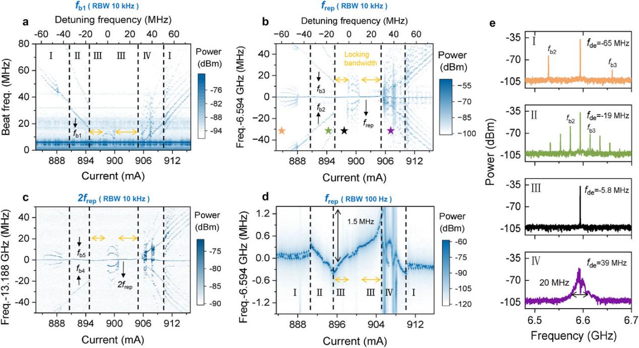 图 2 展示了当单模 QCL作为主激光器时,MOI的动态演化过程。系统经历四个不同状态:远失谐状态下(I区域),两个QCL发生耦合,单模与光频梳的梳齿拍频得到下转换的拍频信号fbn(见图2a-c),此时光频梳为自由运行状态,表现为在一定范围内波动(见图2d);频率牵引状态(II区域),光耦合导致频率偏移并产生许多边带;MOI 锁定状态(III区域),单模激光与光频梳最近的梳齿同步,拍频信号fbn消失,仅剩重复频率及其谐波,锁定带宽约 30 MHz,并伴随重复频率线宽显著收窄;重频展宽状态(IV区域),锁定消失,重复频率发生展宽(20 MHz),呈现剧烈抖动。图2(e) 清楚展示了对应于图2(b)中五角星位置的四个典型状态下的频谱特征。