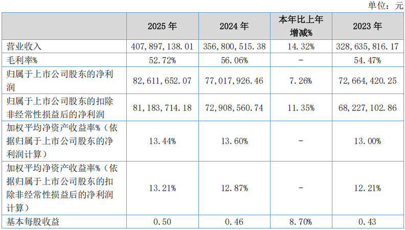 基康技术于2026年3月27日发布2025年年度报告。报告显示,公司2025年度实现营业收入4.08亿元,同比增长14.32%;实现归属于上市公司股东的净利润8,261.17万元,同比增长7.26%;扣除非经常性损益后的净利润为8,118.37万元,同比增长11.35%。