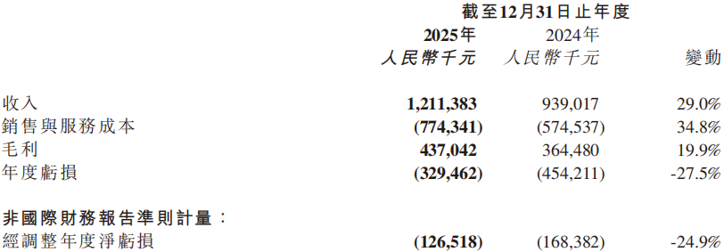 报告期内,公司年度亏损由2024年的人民币4.54亿元减少27.5%至3.29亿元。经调整年度净亏损(非国际财务报告准则计量)为人民币1.27亿元,同比收窄24.9%。毛利率为36.1%,维持在健康水平。